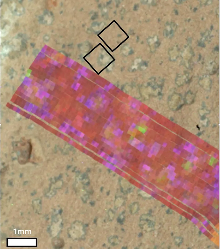 Используя рентгеновское излучение, комбинационное рассеяние света и спектроскопию, Персеверанс идентифицировал два минерала (розовые и зеленые пятна) на марсианской породе, которые являются потенциальным биосигналом прежней жизни на Марсе. Фото: NASA/JPL-Caltech.