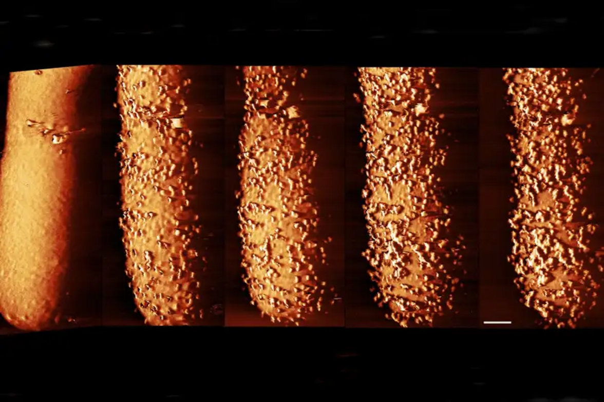 Изображения E. coli, подвергшейся воздействию полимиксина В, демонстрирующие изменения внешней мембраны, слева направо: без воздействия; бактерия после 15 минут воздействия антибиотика; через 30 минут; через 60 минут; через 90 минут. Фото: Carolina Borrelli, Edward Douglas et al./Nature Microbiology.